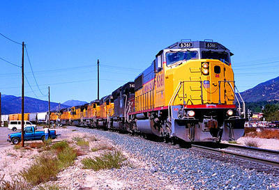 Union Pacific SD60M puzzle, based on an original photo by Phil Cotterill (photo copyright Phil Cotterill -- used with permission). Photographed at Verdemont, California, October 10, 2000.