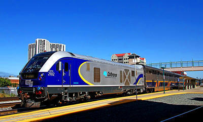 Amtrak SC-44 puzzle, based on an original photo by Joel Hinkhouse (photo copyright Joel Hinkhouse -- used with permission). Photographed at Emeryville, California, July 11, 2019.