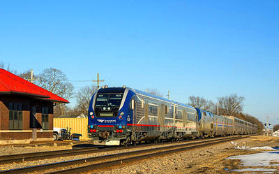 Amtrak SC-44 puzzle, based on an original photo by Robert Jordan (photo copyright Robert Jordan -- used with permission). Photographed at Earlville, Illinois, February 18, 2020.