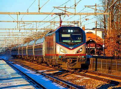 Amtrak ACS-64 puzzle, based on an original photo by Sean McPherson (photo copyright Sean McPherson -- used with permission). Photographed at Attleboro, Massachusetts, January 1, 2018.