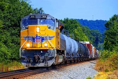 Union Pacific SD70AH-T4 puzzle, based on an original photo by Kerry Douglas (photo copyright Kerry Douglas -- used with permission). Photographed at Apison, Tennessee, August 13, 2022.